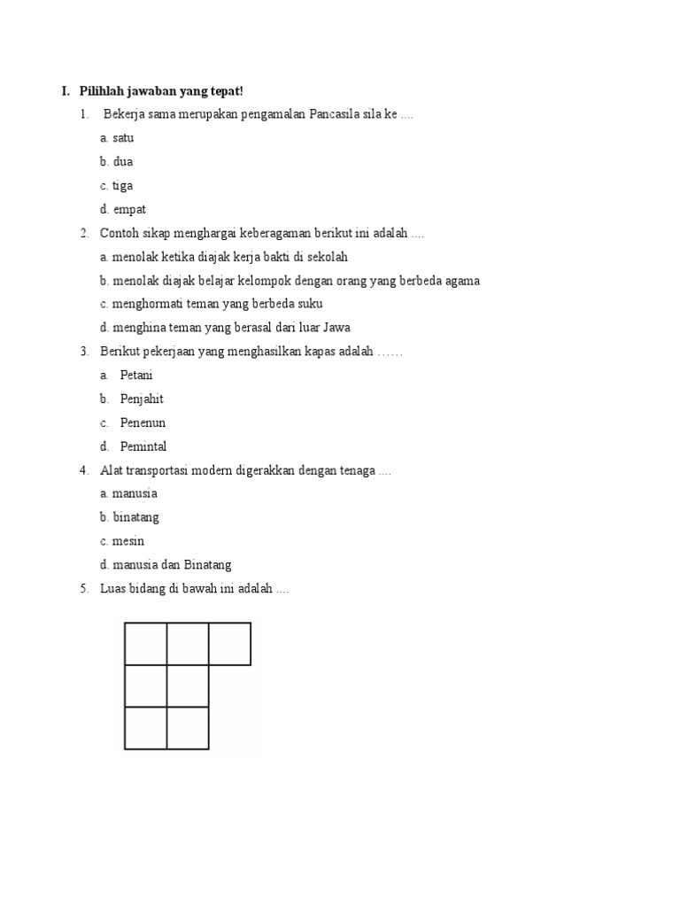 Pilihan Ganda: Ini adalah format paling umum. Siswa harus memilih satu jawaban yang paling tepat dari beberapa opsi yang diberikan. Soal pilihan ganda menguji kemampuan mengingat, memahami, dan kadang-kadang menganalisis informasi.