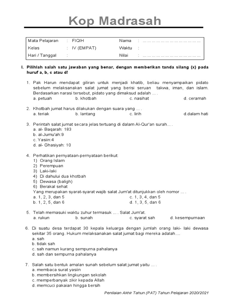 Pendidikan Fiqih Madah (MD) di Madrasah Ibtidaiyah (MI) memegang peranan krusial dalam menanamkan pemahaman dasar tentang ajaran Islam kepada generasi muda. Bagi siswa Kelas 4 MI, materi Fiqih MD semakin mendalam, mencakup berbagai aspek ibadah, muamalah, dan akhlak yang relevan dengan kehidupan sehari-hari. Untuk membantu siswa dan pendidik dalam menguasai materi ini, artikel ini akan menyajikan pembahasan mendalam mengenai konsep-konsep penting dalam Fiqih MD Kelas 4 MI, dilengkapi dengan contoh-contoh soal yang variatif dan mendidik.